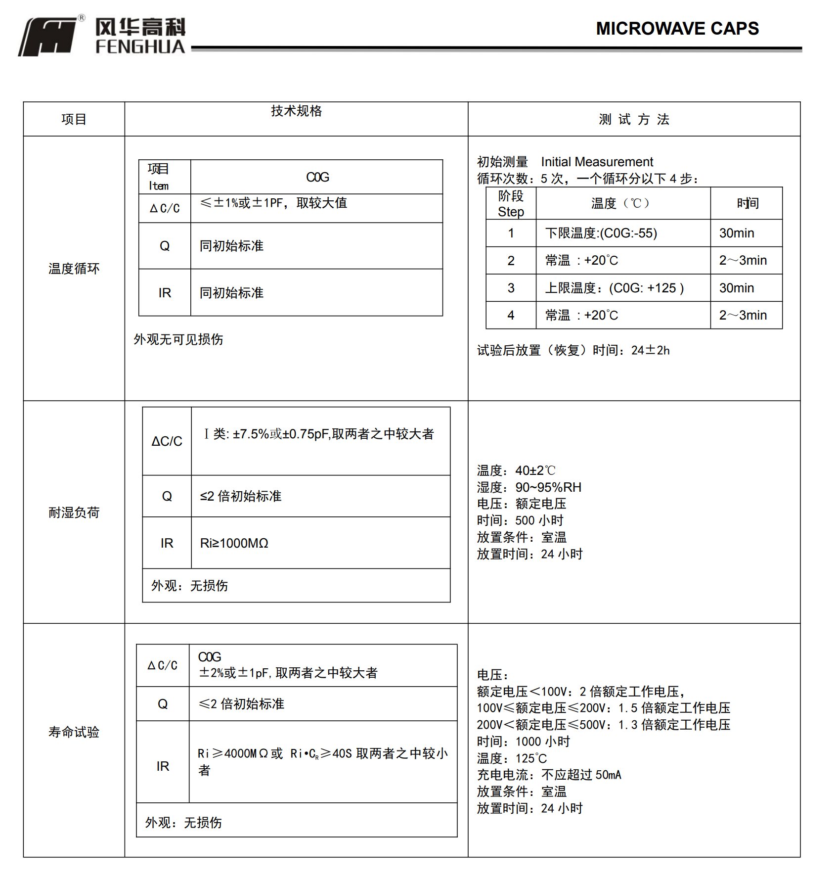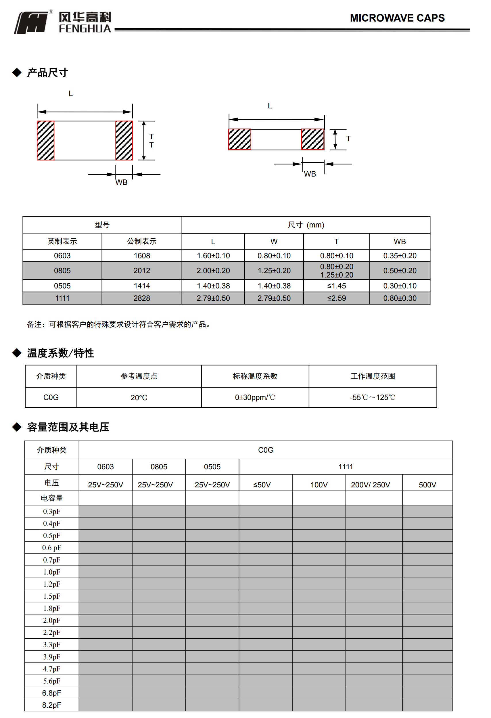 微波电容(RF系列)多层片式陶瓷电容器◆ 特征* 叠层独石结构,具有高可靠性能* 具有优良的焊接与耐焊性能,适用于回流焊接与波峰焊接* 具有较高的容量且容量性能稳定* 高 Q 值* 低等效串联电阻* 高自谐振频率* 执行标准:GB/T 21041-200◆ 应用* 移动通信基站* 无线通信产* 射频功率放大器* 阻抗匹配网络* 滤波网络* VCO