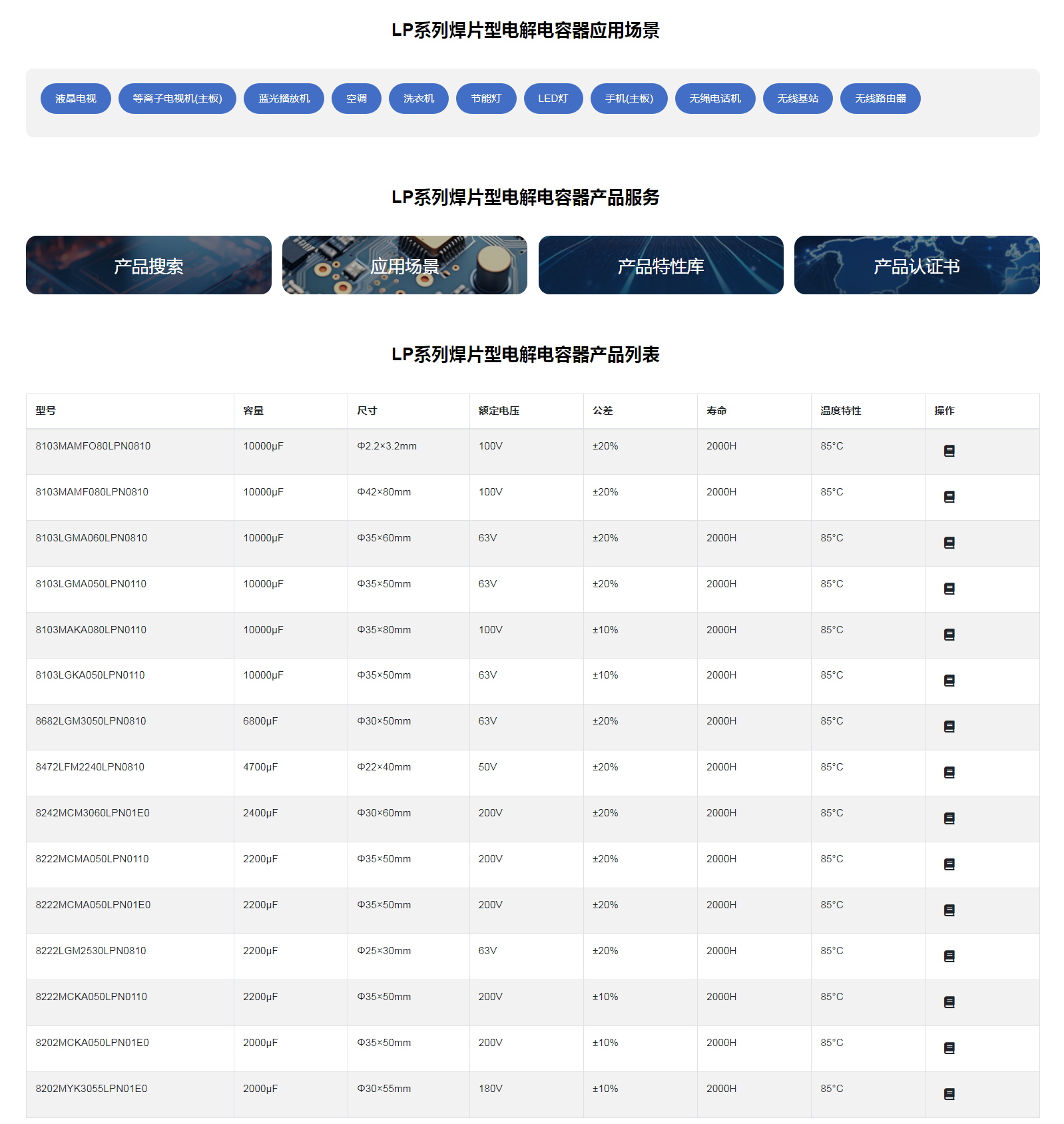 ■LP系列焊片型电解电容器◆特征* 寿命: 85℃(105℃)2000 小时* 小型化;* 符合 RoHS◆应用:* 适用于开关电源 、通信设备及其它各种电子产品。